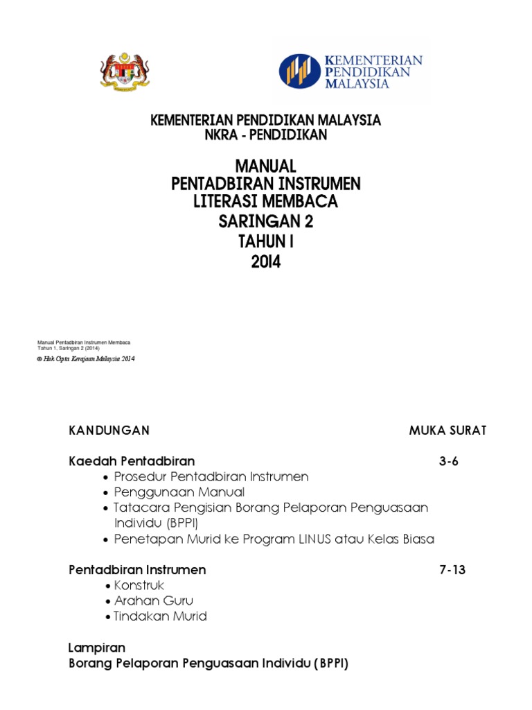 Manual Pentadbiran Instrumen Literasi Membaca Saringan 2 Tahun 1 2014 Pdf